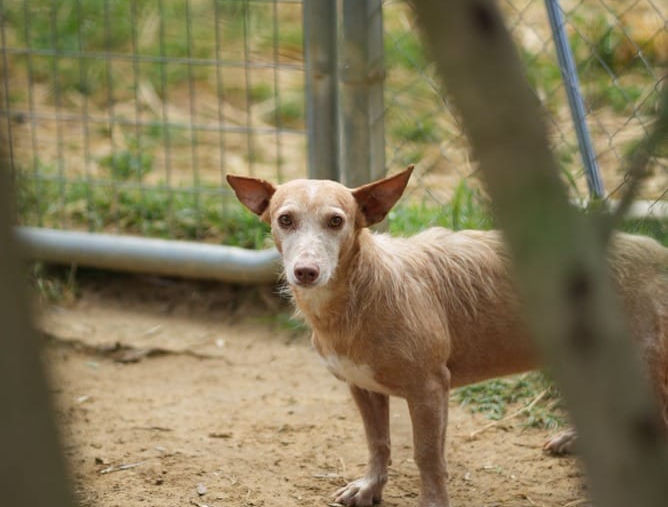 Hij is geen typische Podenco. Cosmo is rustig, verlegen en brengt het liefst lange uren door in zijn mand. Liever lui dan moe is zijn levensmotto. Hij laat zich wel aaien en knuffelen, maar heeft tijd nodig om mensen te leren vertrouwen.